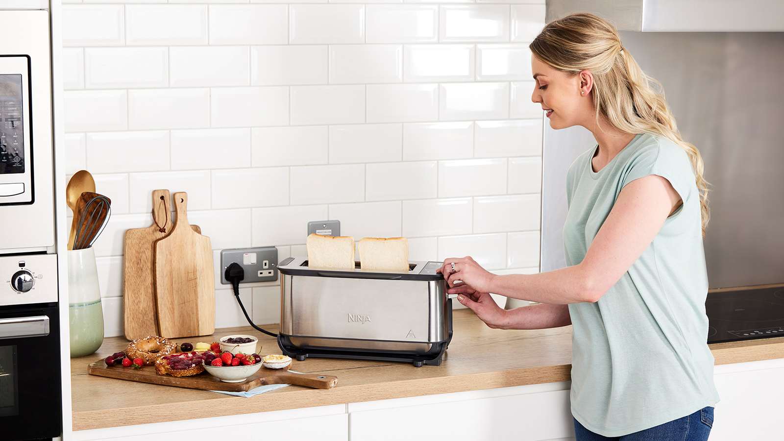 - Den lange, brede spalte passer nemt til bagerbrød eller 2 bagel-halvdele