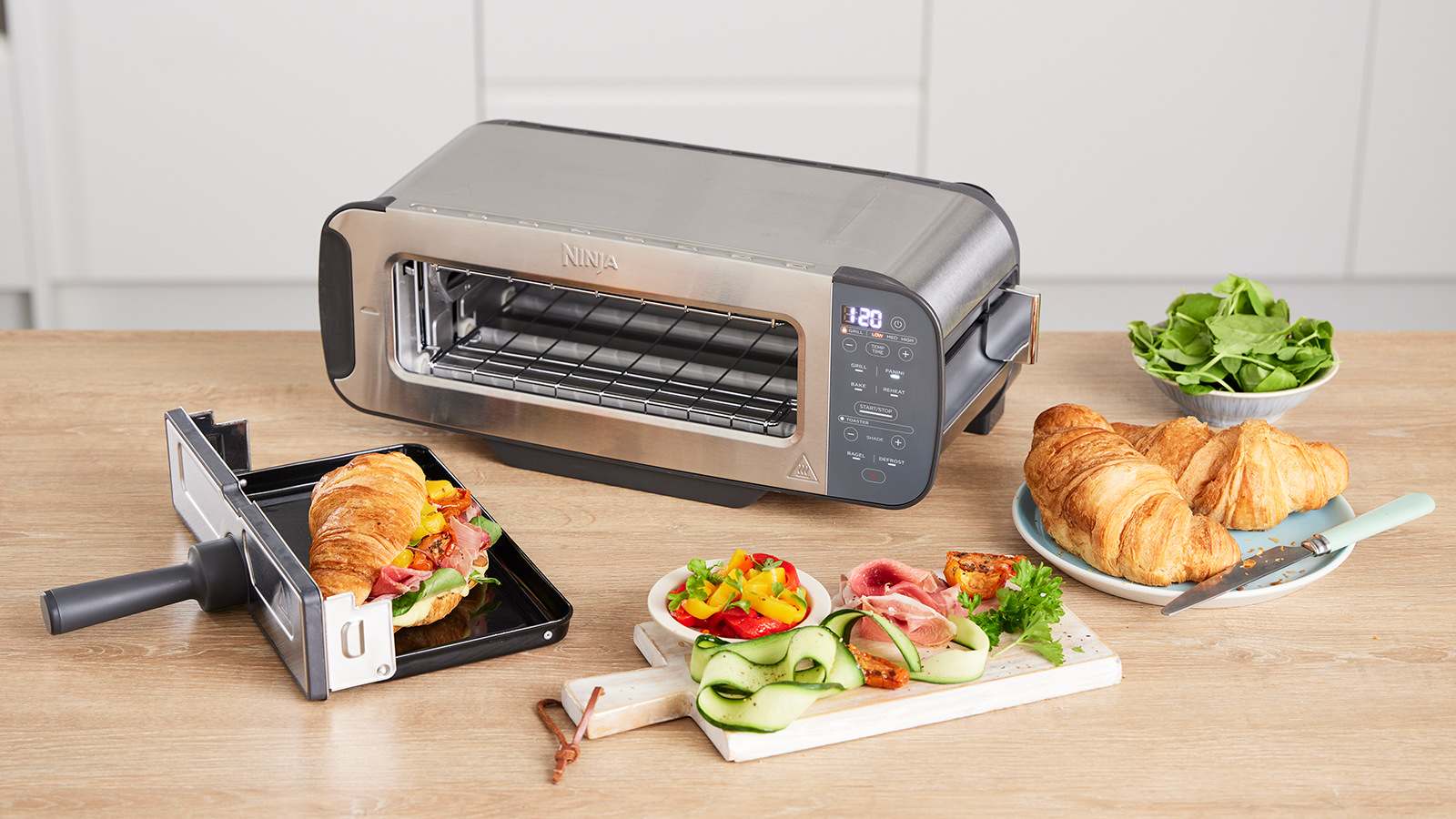 Vær kreativ med 7 tilberedningsfunktioner – Toast (Toast), Bagel (Bagel), Grill (Grill), Panini (Panini), Bake (Bagning) og Reheat (Genopvamning).