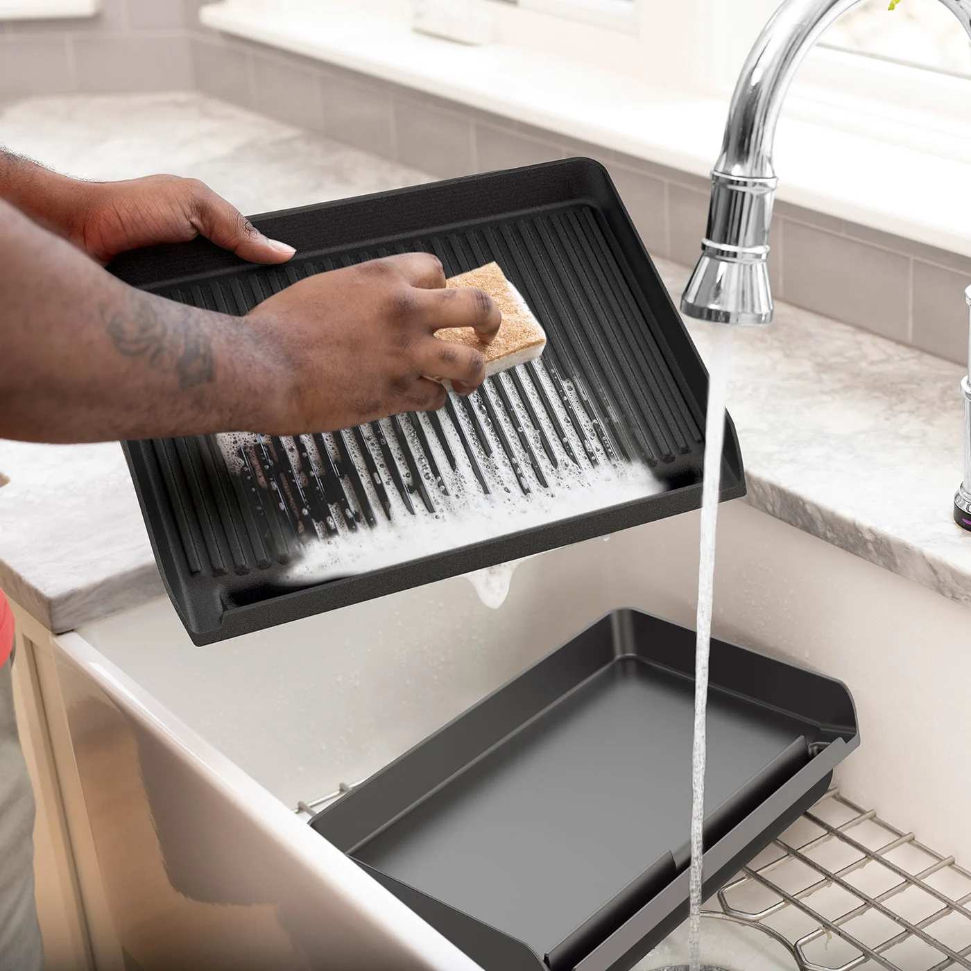 Tilbered med låget på eller af: Med låget oppe kan du give maden et pust af koncentreret varme for autentiske grillede smage og en perfekt bruning – fantastisk til tilberedning af delikate fødevarer eller magre proteiner som grillet fisk og grøntsager, uden at overtilberede maden, eller til mad, der kræver vending, såsom æg, pandekager og stirfry. Luk låget for at holde på varmen og smelte toppings – perfekt til en boblende ristet sandwich, tilberedning af tykke stykker bøf eller frosne rejer. Det aftagelige, perforerede netlåg hjælper også med at forhindre stænk og kan fjernes for nem rengøring, så du undgår opbygning af fedt.