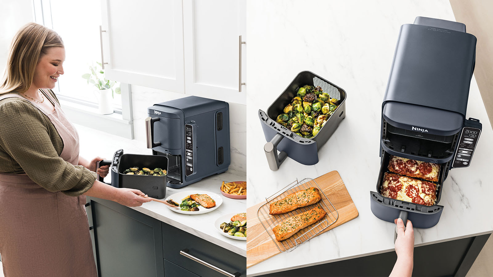 I modsætning til traditionelle side-by-side-airfryere med to skuffer frigør to lodrette, stablede skuffer plads på dit køkkenbord, så du kan mikse og matche tilberedningsfunktioner, tider og temperaturer – selv i mindre køkkener.